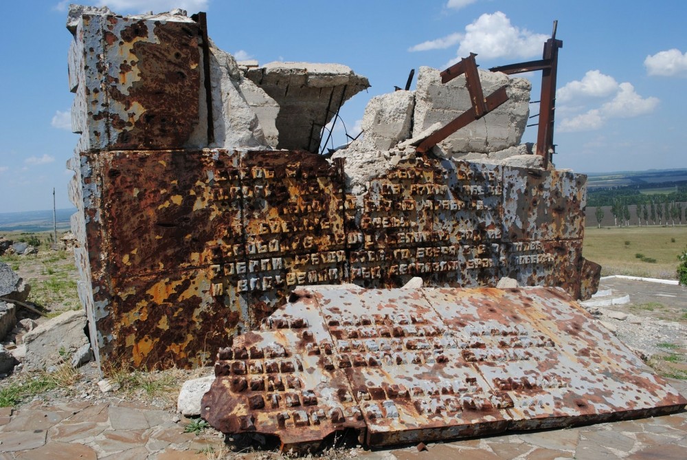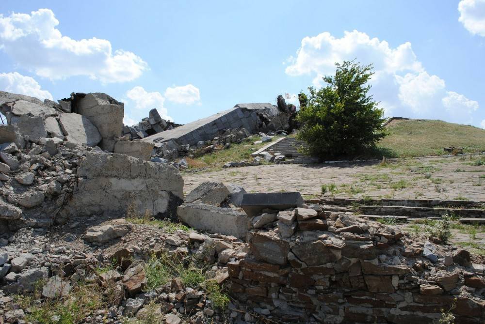 Так, мемориальный комплекс был разрушен обстрелами в 2014 году, однако до сегодняшнего дня поврежденные элементы не восстановлены. У подножия кургана – стела с именами погибших. Она посечена осколками, но покрашена свежей краской. Ступеньки, ведущие наверх, – разбиты.