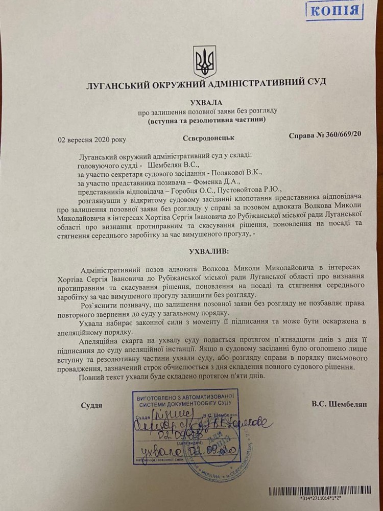 Луганский окружной административный суд оставил без рассмотрения исковое заявление в деле по иску адвоката Николая Волкова в интересах экс-мэра Сергея Хортива к Рубежанскому горсовету о признании противоправным и отмене решения, возобновления на должности и взыскании среднего заработка во время вынужденного прогула.