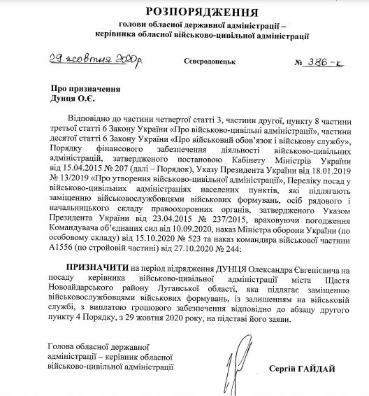 Председатель Луганской ОГА Сергей Гайдай назначил нового главу военно-гражданской администрации Счастья. Об этом сказано в распоряжении, опубликованном на сайте ЛОГА.