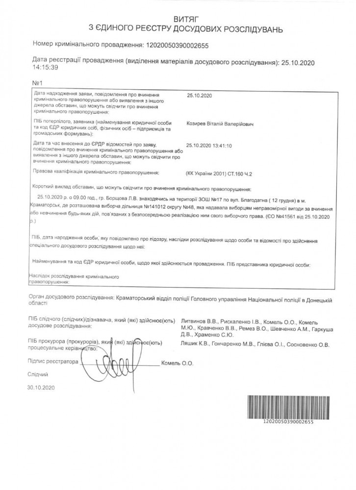 Кроме того, во время голосования в первом туре зафиксирован факт скупки голосов в пользу ОПЗЖ. Желающих продать свои голоса собирали через соцсети и по сеткам пенсионеров. За голос в Краматорске платили по 100-200 гривен. Ряд фактов подкупа был зафиксирован правоохранителями (документы).