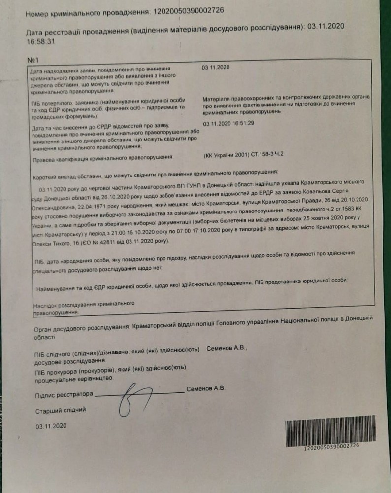 Бюллетени для голосования печатаются на типографии, которую возглавляет кандидат в депутаты Краматорского горсовета от партии Ефимова «Наш Краматорск» Юрий Мельник. То есть, фактически один из политиков полностью контролирует печать всех бюллетеней и тут, наверно, не нужно ничего объяснять. Против директора типографии уже возбуждено уголовное дело: для голосования в первом туре типография печатала бюллетени ночью, без наблюдателей и без видео фиксации. Сколько их напечатали – не известно (см. документ).