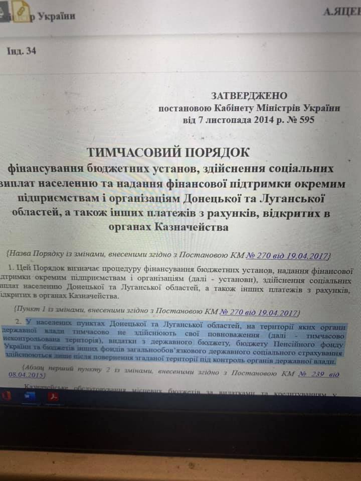 Заявители - группа пенсионеров, которые проживали в ОРДЛО. Они обратились в административные суды, оспаривая постановление Кабмина № 595, которым был утвержден "Временный порядок финансирования бюджетных учреждений, осуществление социальных выплат населению ...", п. 2 которого останавливались расходы из государственного бюджета на социальные выплаты на временно неконтролируемой территории до ее возвращения под контроль органов государственной власти Украины.