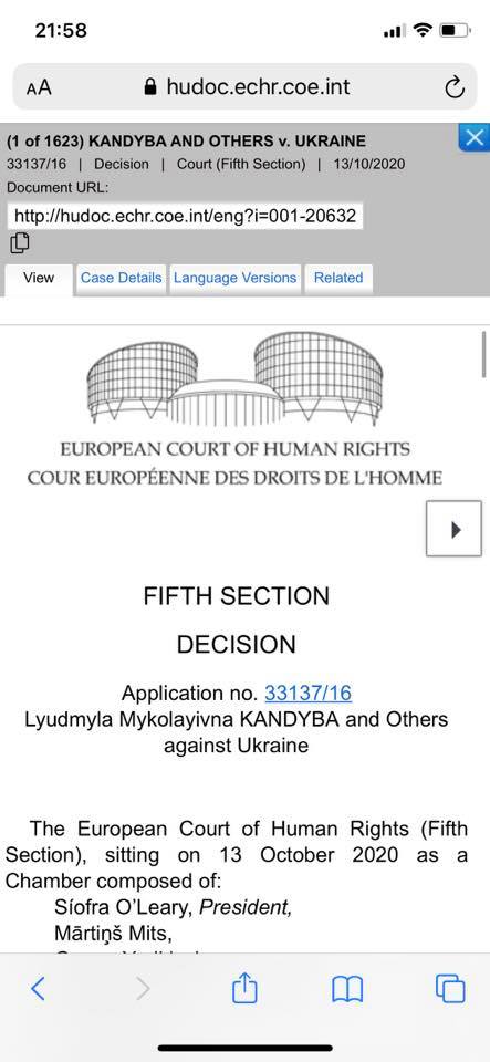 Так, ЕСПЧ принял решение в пользу правительства и признал неприемлимым заявление по делу "Kandyba and Others v. Ukraine, no. 33137/16".