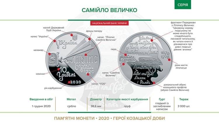 Монета "Самойло Величко" из серебра вводится в обращение 1 декабря номиналом 10 грн, тиражом 3 тысячи штук.