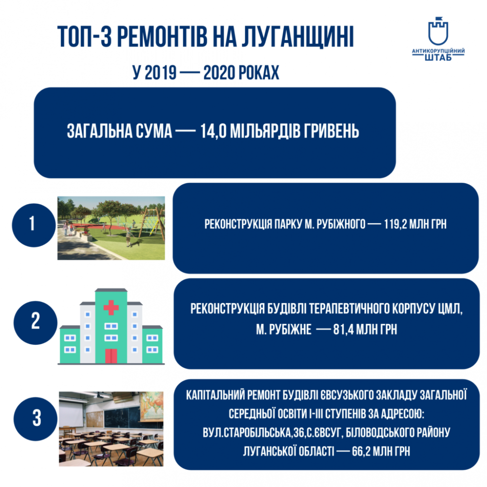 В рамках проекта "Карты ремонтов" общественники представили рейтинг за период 2019 - 2020 гг, в котором Луганская область заняла 14-е место. На ремонт, восстановление и реконструкцию разных объектов здесь потратили 14 млрд грн бюджетных средств.