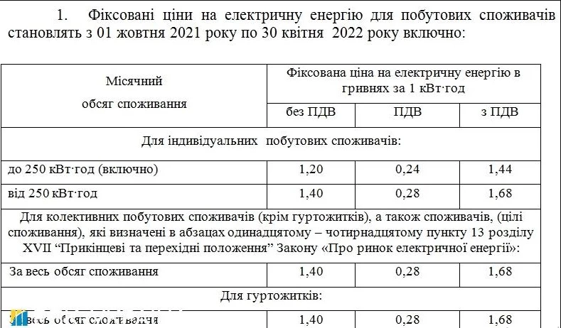 Согласно документу, цены останутся на уровне 1,68 гривен за 1 кВт-ч для потребления свыше 250 кВт-ч в месяц.