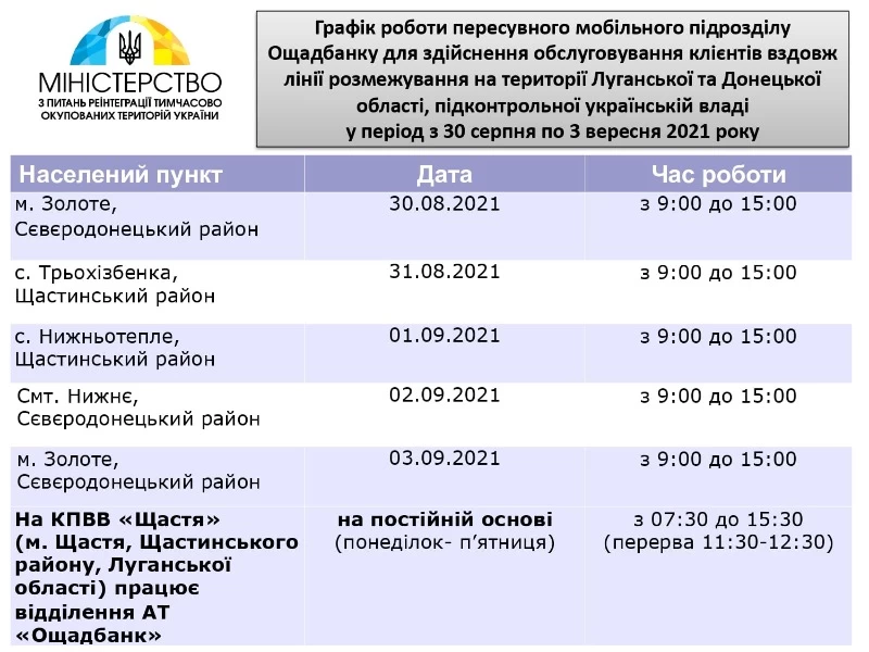 С целью расширения территории банковского обслуживания населения и обеспечения государством своевременного выполнения социальных выплат и пособий у линии разграничения в Луганской области, АО «Ощадбанк» осуществляются мероприятия по функционированию передвижных мобильных подразделений банка на базе автомобиля КрАЗ.