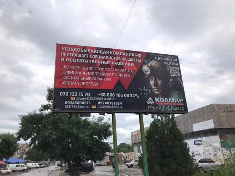 "Учитывая все эти проблемы, горняки из ОРДЛО массово выезжают на работу в РФ. Фото билборда сделано в Красном Луче Луганской области. Компания из Якутии уже шесть месяцев работает над рекрутингом шахтеров из ОРДЛО.