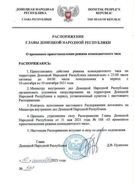 Комендантский час в ОРДО до конца сентября не будет действовать с вечера пятницы до утра понедельника. Соответствующее "распоряжение" главаря группировки "ДНР" Дениса Пушилина опубликовано на его сайте.