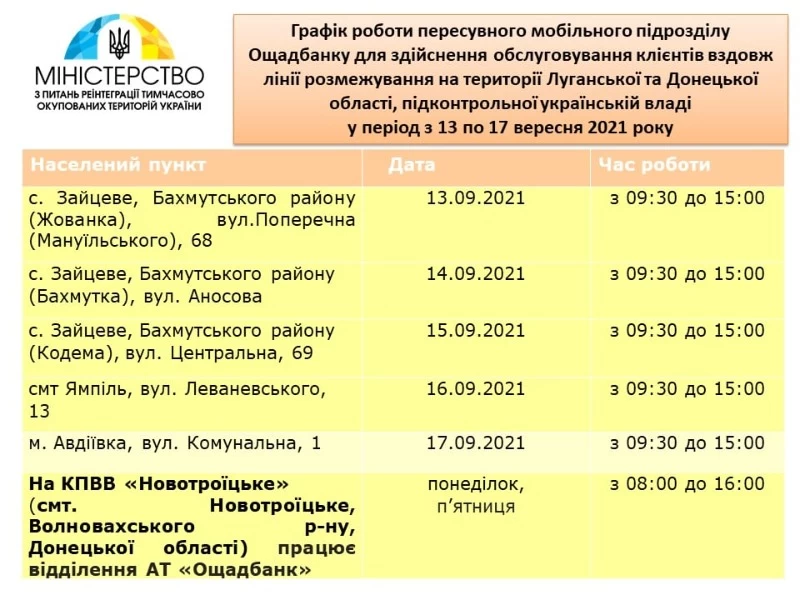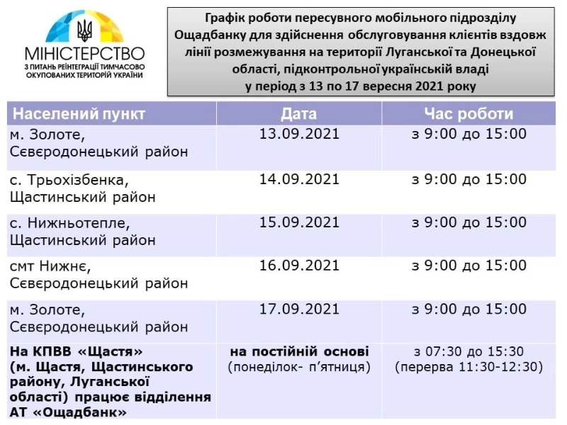 С 13 по 17 сентября у линии разграничения в Луганской и Донецкой областях будут работать мобильные подразделения Ощадбанка.