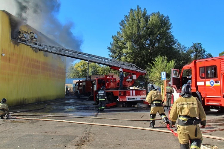На место происшествия оперативно были направлены пожарно-спасательные подразделения по повышенному номеру вызова. По прибытии к месту было установлено, что горение происходит в здании склада готовой продукции. Кроме этого, произошло частичное обрушение кровли и возникла угроза распространения огня на 3-х этажную административную часть здания. На момент прибытия подразделений кровля здания склада была охвачена огнем практически по всей площади.