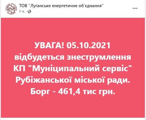 "Луганское энергетическое объединение" обещает обесточить КП "Муниципальный сервис" Рубежанского горсовета.