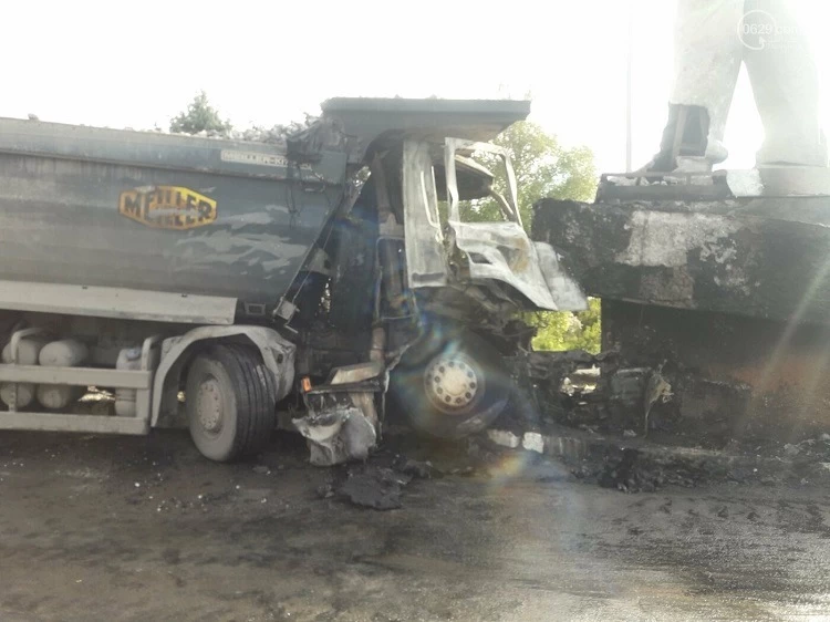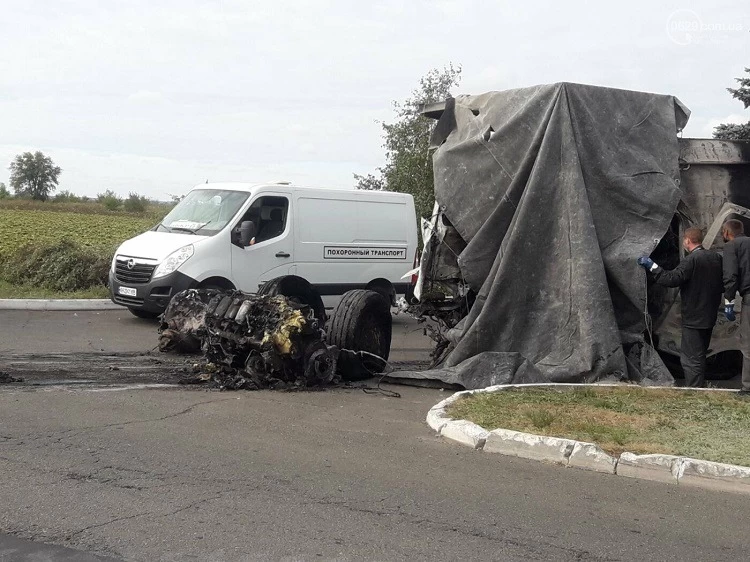 От удара автомобиль загорелся. Кабина полностью смята.