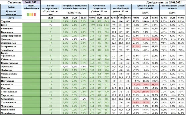 По данным за 23 сентября, уровень госпитализации пациентов с COVID-19 в Украине в целом составляет 31,9 человек на 100 тыс. населения. Самый высокий уровень госпитализации в Черновицкой области - 52,8 человек на 100 тыс. населения при норме не более 60 чел. человек на 100 тыс. населения.