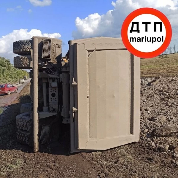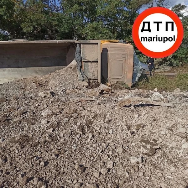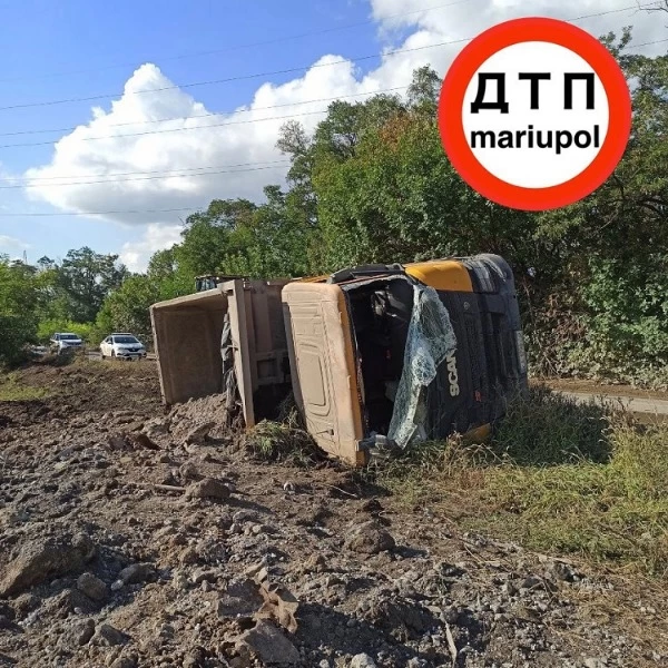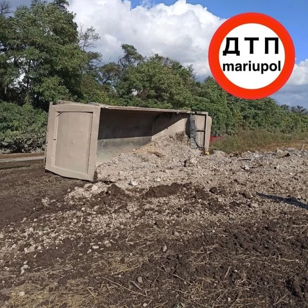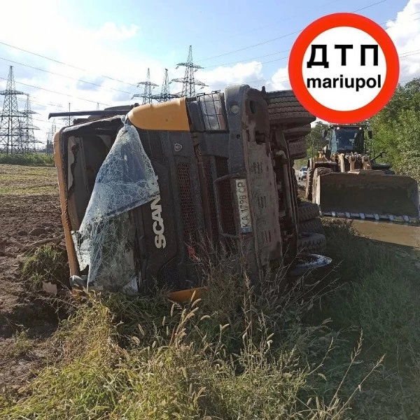 По предварительной информации, водитель самосвала "Scania" не справился с управлением, выехал за пределы проезжей части и опрокинулся набок.