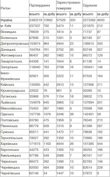 За все время пандемии в Украине коронавирус обнаружили у 2 482 518 человек, из них выздоровели 2 273 382 человека, умерли 57 526 больных всего проведено ПЦР-тестов 13 058 358.