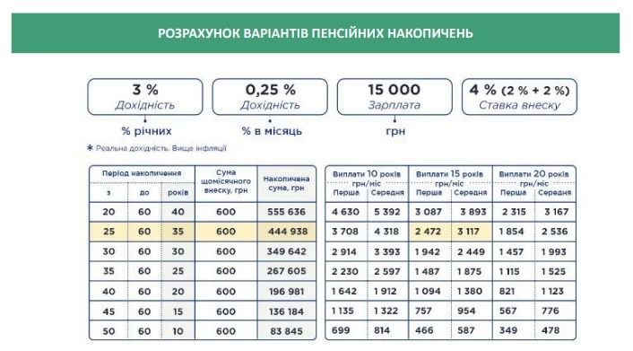 Поэтому средняя пенсия по накопительной системе за 15 лет у человека составит 3117 гривен. Вместе с солидарной пенсией человек будет получать 6741 гривну (45% зарплаты).