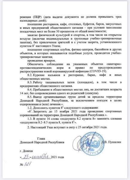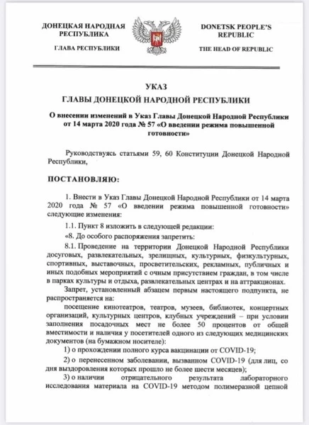 Посещение кинотеатров, театров, музеев, библиотек, концертных организаций и центров, клубных учреждений в ОРДО с 25 октября будет разрешено лишь при условии заполнения не более 50% посадочных мест и наличия у посетителей соответствующих "документов". Об этом говорится в "указе" №321 главаря группировки "ДНР" Дениса Пушилина, передает рупор боевиков "ДАН".