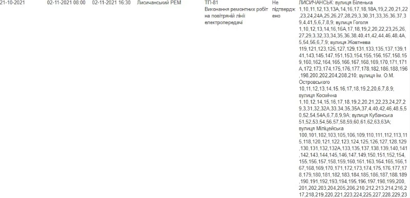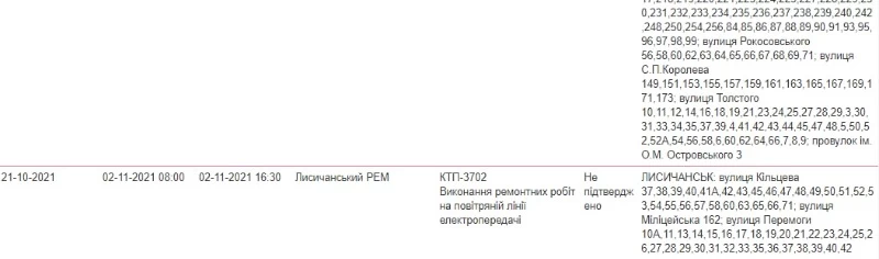Во вторник, 2 ноября, в Северодонецке, Лисичанске и Рубежном будут отключать свет.