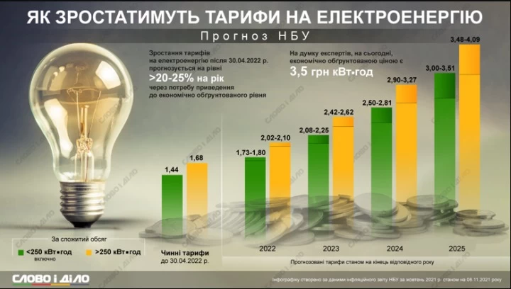 Национальный банк Украины в своем отчете сообщил, что рост тарифов на электроэнергию после апреля следующего года прогнозируется на уровне +20-25% в год. Причина – потребность приведения тарифов к экономически обоснованному уровню, сообщает "Слово и дело".
