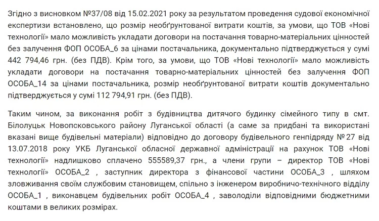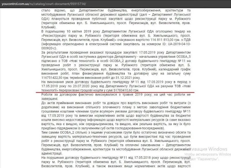 Як вже зазначалося, в тексті постанови Сєвєродонецького міського суду Луганської області № 95915714 від 25.03.2021 року безальтернативно та чітко вказано наступне: «На виконання умов договору будівельного генпідряду №11 від 17.05.2019 року в період з 17.05.2019 року по 23.07.2020 року від Департаменту Луганської ОДА на рахунки ТОВ «Нові технології» перераховані грошові кошти у сумі 51 млн 783 тис. 410,60 грн».