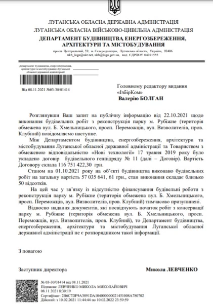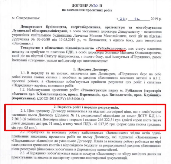 Згідно з договором проєкт реконструкції парку у м. Рубіжне коштував 246 тис. 222,31 грн