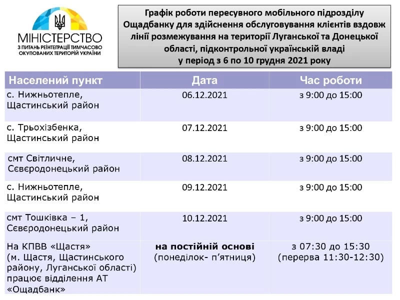 В Минреинтеграции опубликовали график работы передвижных мобильных подразделений Ощадбанка возле линии разграничения в Луганской и Донецкой областях Украины.