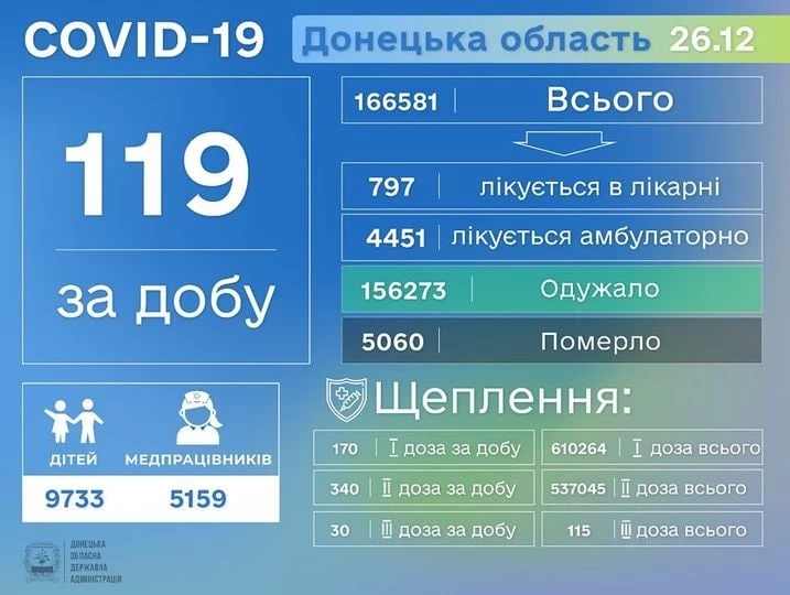 За минувшие сутки, 26 декабря, в Донецкой области выявили 119 новых случаев коронавируса.