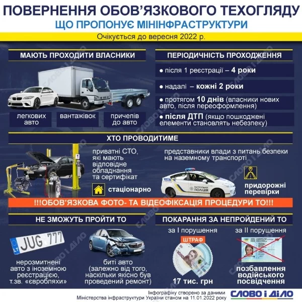 В Украине в этом году могут вернуть требование об обязательном техническом осмотре для автомобилей. Его отменили еще в 2011 году, но, согласно директивам Евросоюза, эту норму должны вернуть – соответствующий законопроект в Министерстве инфраструктуры разработали еще весной. Чтобы изменения вступили в силу, законопроект должны одобрить на уровне Кабмина, затем зарегистрировать в Верховной Раде, а там слово за нардепами.