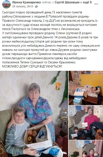 "Сегодня плодотворно проведен день. 15 населённых пунктов района. В Попасной навестили семью – Правило Александр - инвалид 2 группы. ДЦП, не разговаривает, не выходит. Из-за отсутствия судьи несколько месяцев не решается вопрос пенсии. Заботится об Александре тетя из Лисичанска", - сообщила она на своей странице в Facebook.