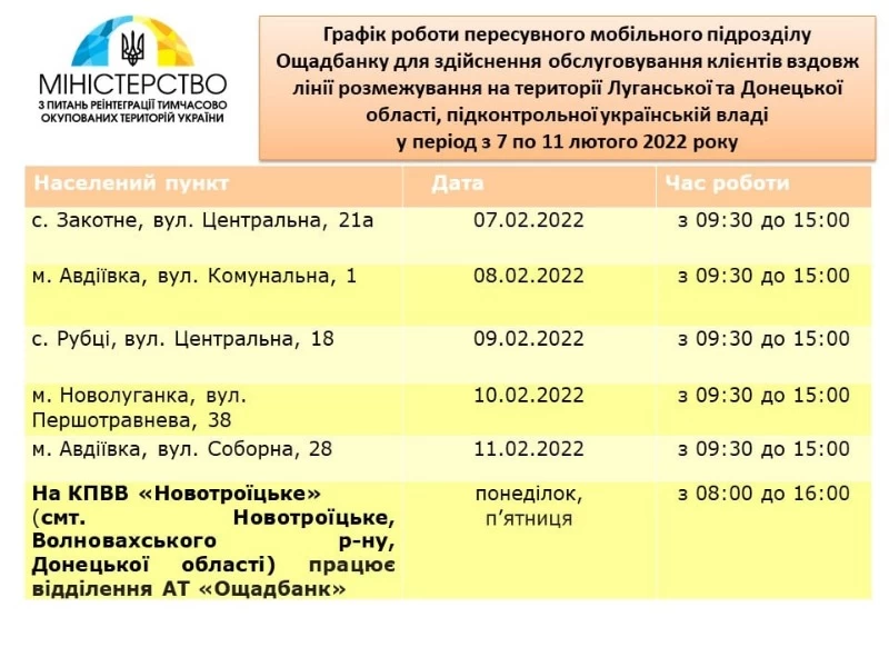 Министерство по вопросам реинтеграции временно оккупированных территорий опубликовало график работы передвижных мобильных подразделений "Ощадбанка" возле линии разграничения в Луганской и Донецкой областях с 7 по 11 февраля.