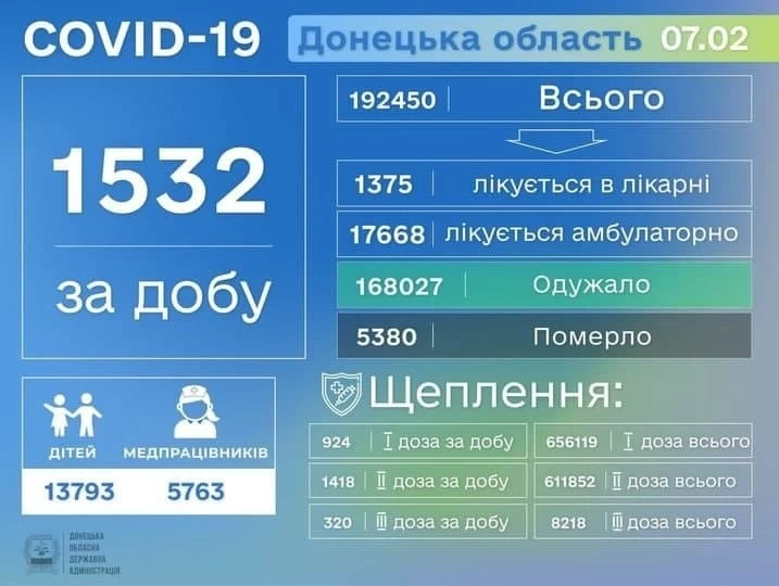За минувшие сутки, 7 февраля, в Донецкой области зарегистрировали 1532 новых случаев коронавируса.