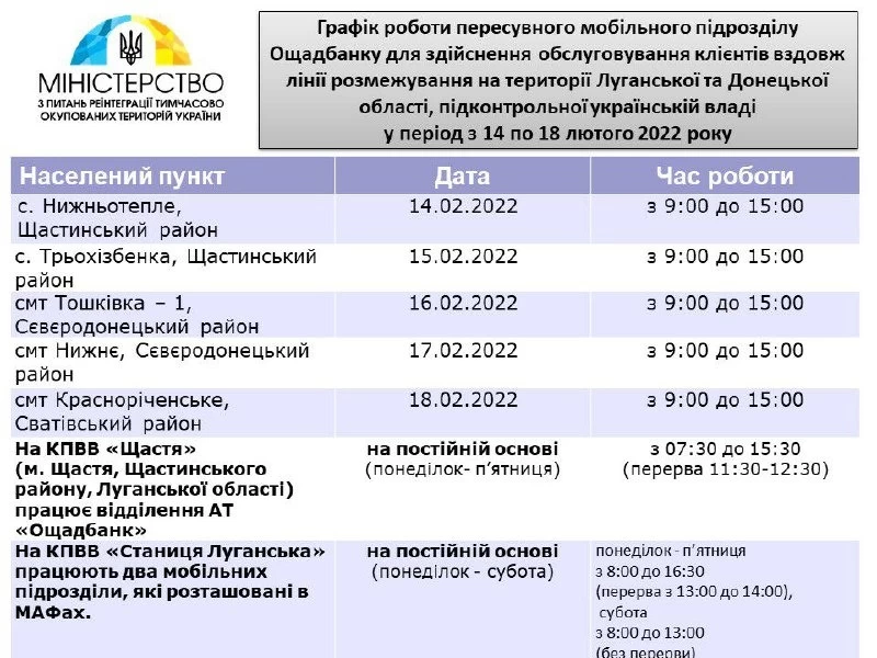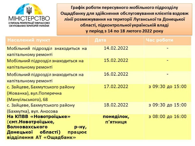 Опубликован график работы передвижных мобильных подразделений Ощадбанка возле линии разграничения в Луганской и Донецкой областях Украины с 14 по 18 февраля.