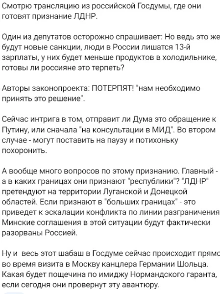 Мнение журналиста Андрея Дихтяренко по поводу возможного признания "ЛДНР" Россией, изложенное им в Телеграмм - канале "Реальный Донбасс. Дихтяренко".