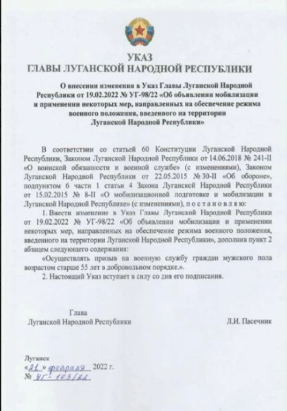 Таким образом Пасечник внес изменения в предыдущий "указ" от 19 февраля "Об объявлении мобилизации и применении некоторых мер, направленных на обеспечение режима военного положения, введенного на территории Луганской народной Республики".