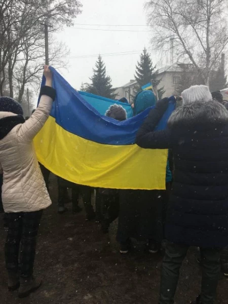 В поселок вошла российская военная техника с маркировкой "Z". Местные жители с украинскими флагами вышли захватчиков.
