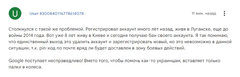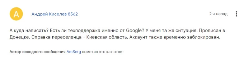 Пользователь с ником AmSerg написал, что живет в Украине, имеет платежные счета в украинских банках, по он все равно попал под санкции Google.