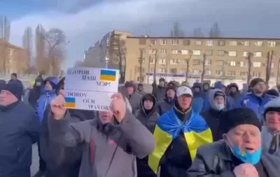Жители города обратились к российским оккупантам с требованием освободить похищенного мэра. Люди скандировали "Свободу мэру" и кричали "Отдайте Федорова".