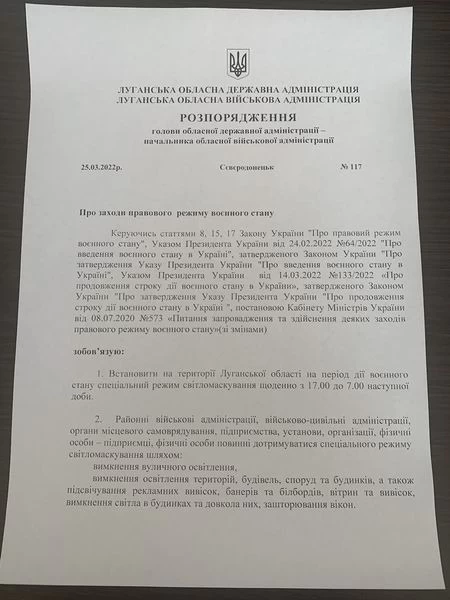 Луганская область на период военного положения устанавливает ежедневный режим светомаскировки. Он будет действовать с 17:00 до 07:00.