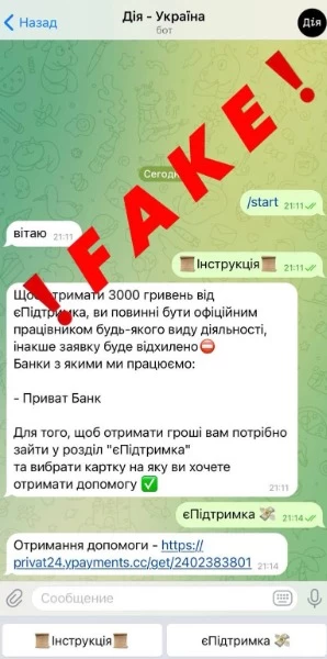 Мошенники создали фейковый чат-бот государственной платформы "Дія", в котором предлагают "получить 3000 гривен денежной поддержки от государства".