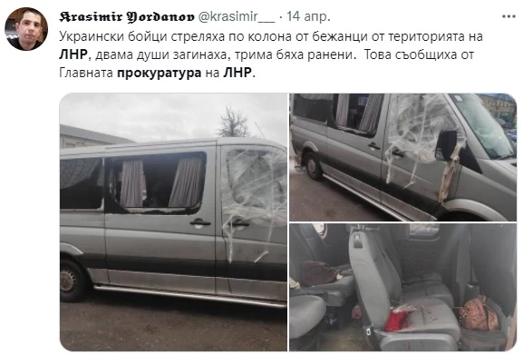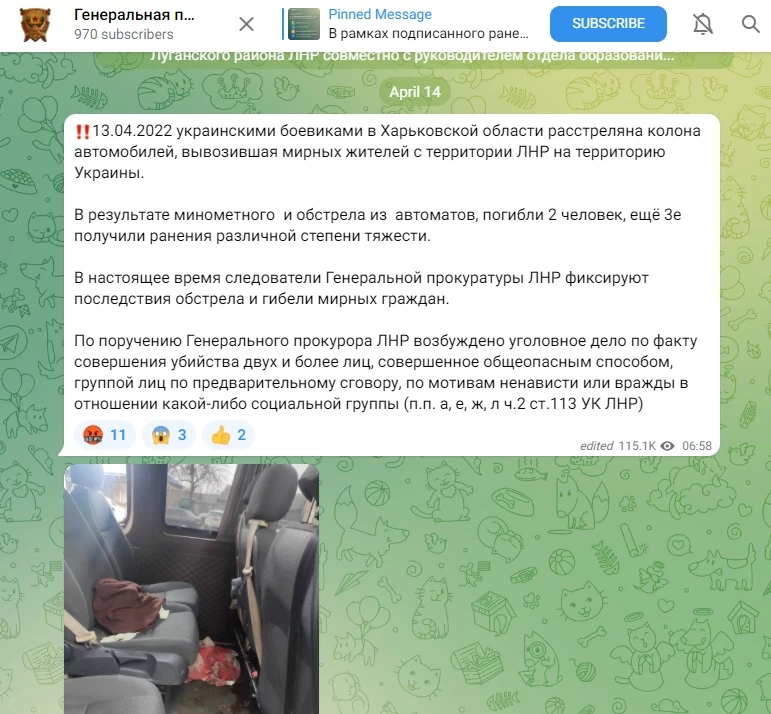 13 апреля я писал об обстреле перевозчиков, которые вывозили людей из Старобельска. На следующий день т.н. "генпрокуратура ЛНР" заявила, что огонь по гражданским авто велся якобы со стороны ВСУ и опубликовала фото обстрелянных транспортных средств. Позже часть снимков удалили, оставив лишь кадр, сделанный в салоне. К сожалению, заскринить изначальную версию не успел, но эти фото уже успели разнести по сети боты.