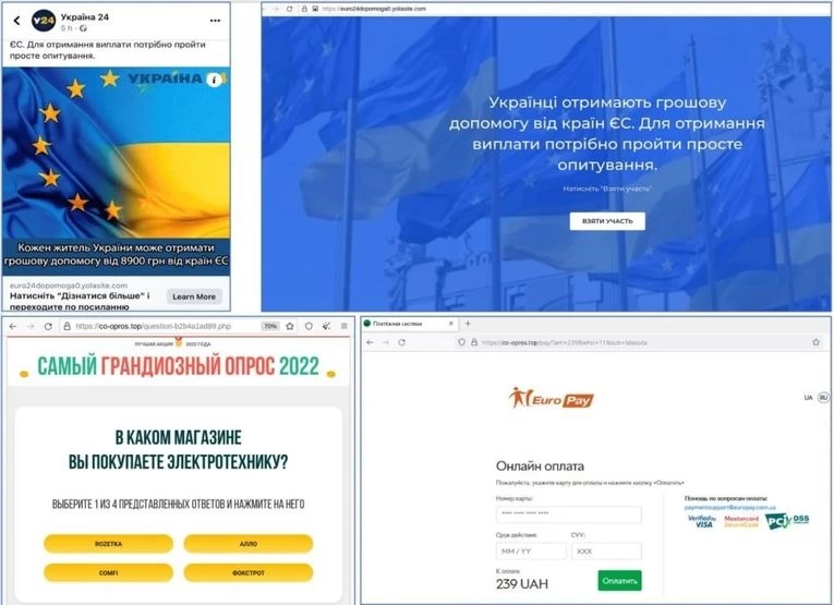Отмечается, что на странице, имитирующей ресурс телеканала "Украина 24", украинцам предлагают принять участие в опросе, перейдя по ссылке, и получить "денежную помощь от стран ЕС".