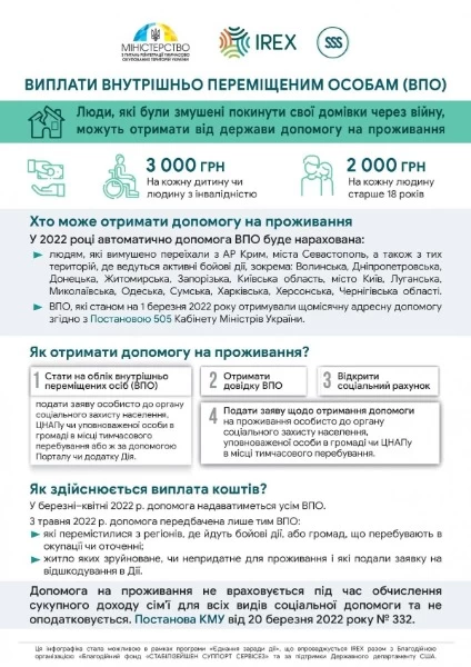 С 1 мая внутренние переселенцы (люди, которые переехали в другие районы Украины из-за боевых действий) получат ежемесячную помощь в размере 2000 грн на взрослого и 3000 грн на ребенка и человека с инвалидностью.