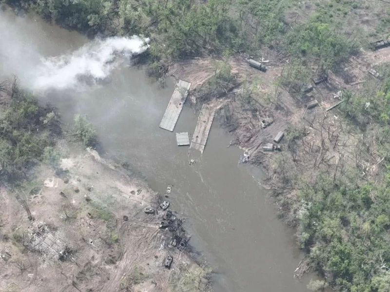 На одном из концов переправы с западного берега Северского Донца поднимается дым. На восточном тоже видны дым и воронки, в том числе вокруг военной техники, пересекшей мост.
