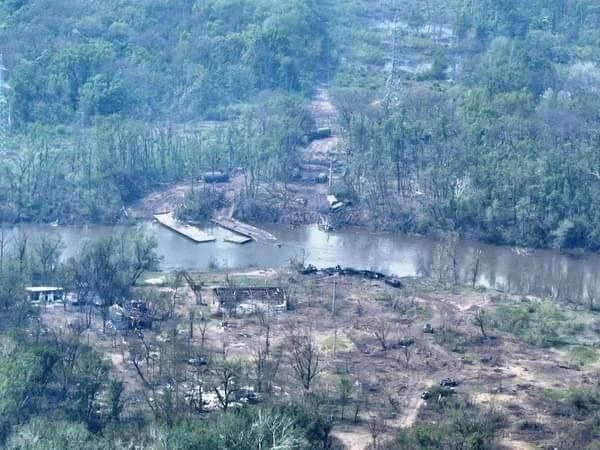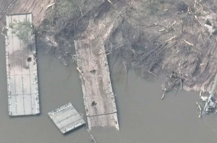 Геопространственная разведывательная компания BlackSky, обнародовала фото, на котором виден российский понтонный мост, пересекающий реку 10 мая, вскоре после того, как украинская артиллерия обстреляла этот район.