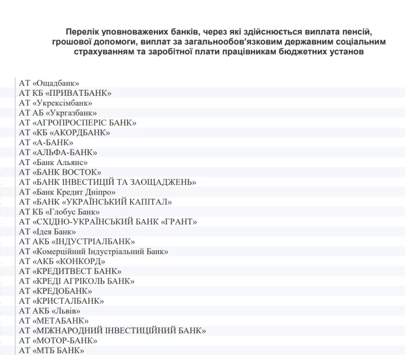 "Установить, что перечень банков, через которые осуществляется выплата пенсий, денежной помощи, выплат по общеобязательному государственному социальному страхованию и заработной платы работникам бюджетных учреждений, сформированный по состоянию на 24 февраля 2022 г., является актуальным и в него не вносятся изменения в течение периода действия военного положения, - говорится в документе.