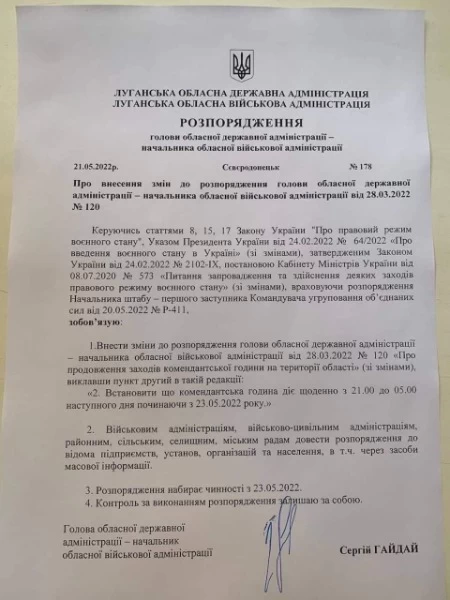 С завтрашнего дня, 23 мая, в Луганской области ограничения на передвижение и специальный режим светомаскировки будут действовать с 21:00 до 05:00. Об этом сообщает глава ЛОВА Сергей Гайдай.