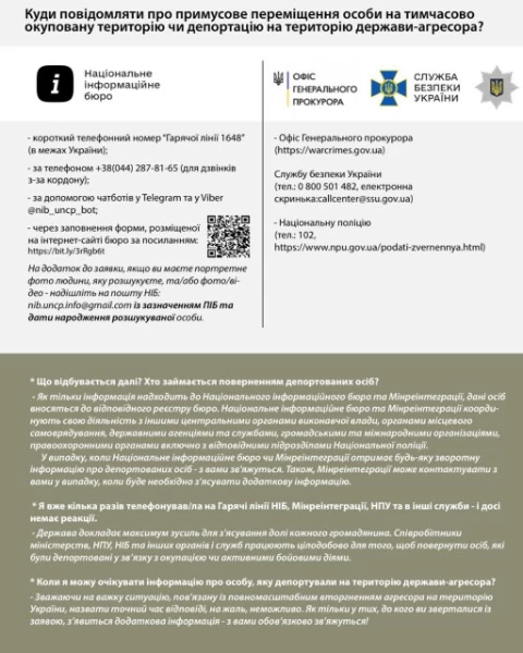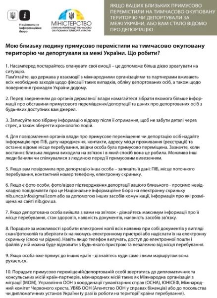 "В первую очередь важно овладеть собственными эмоциями и не поддаваться панике. Помните, что государство во взаимодействии с международными организациями и партнерами принимает все необходимые меры для фиксации таких случаев, учета депортированных лиц, а также прилагают усилия с целью возвращения граждан Украины домой", - сказано в сообщении.