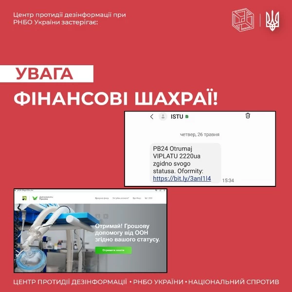“Украинцы начали получать SMS-сообщения с таким текстом: “Otrumaj VIPLATU 2220 ua zgidno svogo statusa. Oformity” (ред. - Получи выплату 2220 гривень согласно своему статусу. Оформить)”, - говорится в сообщении.