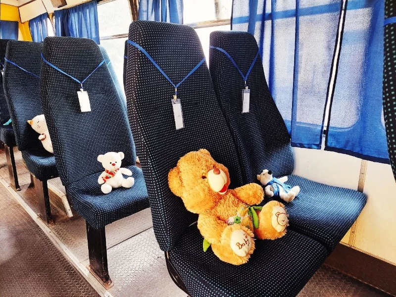 Усі ці автобуси порожні, на кожному з 243 сидінь – покинуті іграшки, а на бейджах – дитячі імена: Святослав, Ігор, Марія…